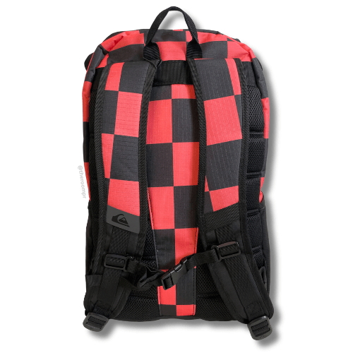 The Quiksilver School-E Chill 26L Backpack in black with red Checkers, offers organized storage with an internal laptop sleeve and a dedicated sunglass pocket. Keep your snacks fresh in the thermal insulated lines pocket, and easily access essentials with the front accessory organizer. Side mesh pockets provide convenient water bottle storage, making this backpack a reliable companion for school or daily adventures.